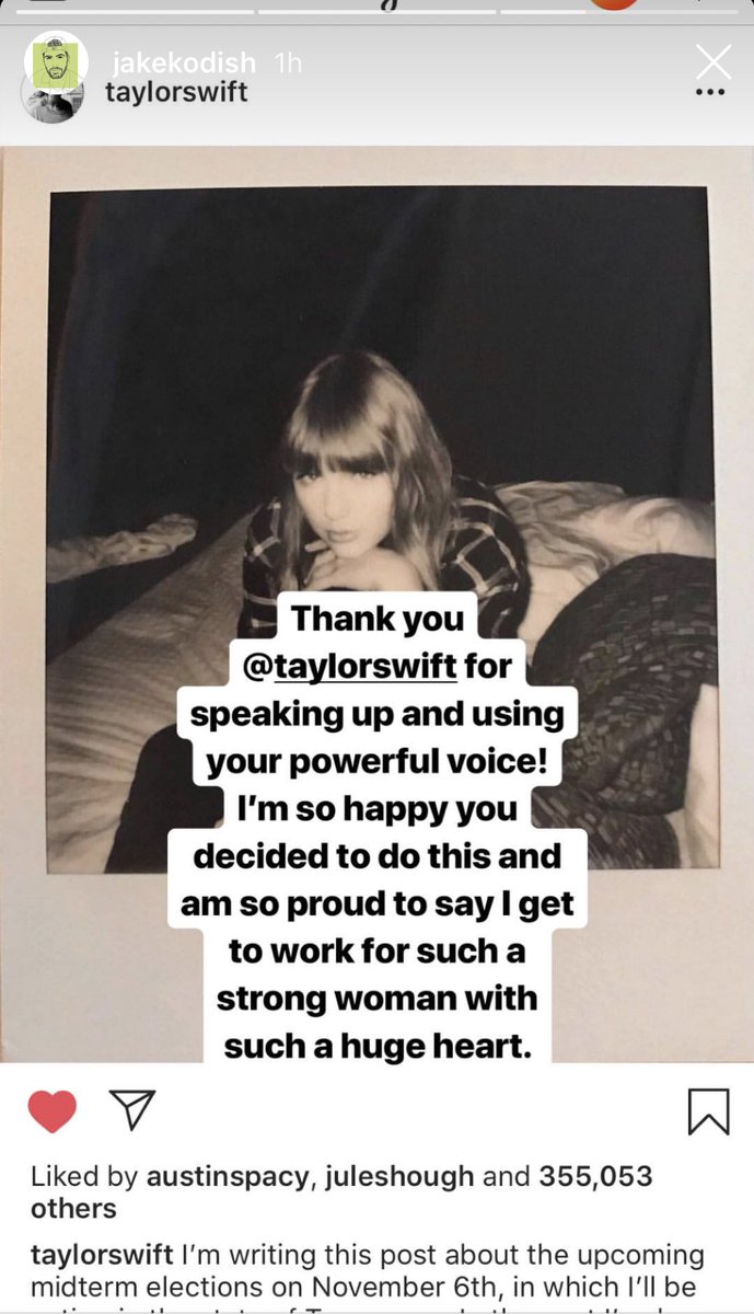 More than 6200 of the 7554 new voters that have registered this month did so after Swifts Instagram post. Im writing this post about the upcoming midterm elections on November 6th in which Ill be voting in the state of Tennessee. In October of 2018 musician Taylor Swift used the social media site Instagram to endorse candidates for the United States Congress in the upcoming election.